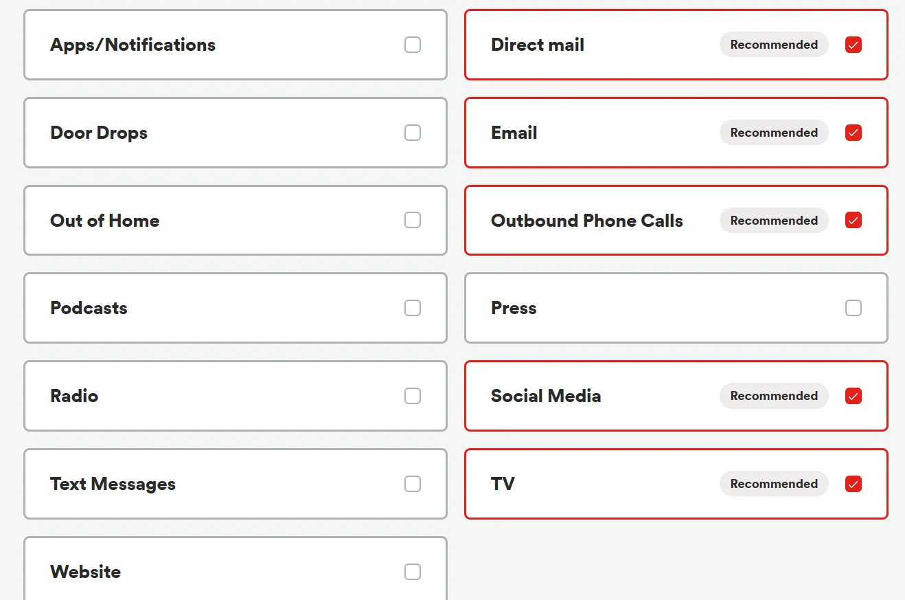 Then the tool recommends six channels that will best help with a campaign to meet the objective.